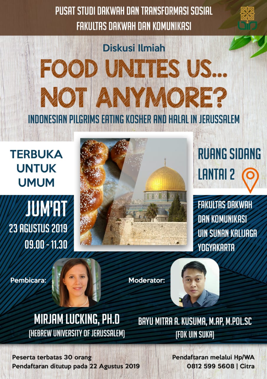 Diskusi Ilmiah "Food Unites Us.. Not Anymore? Indonesian Pilgrims Eating Kosher and Halal in Jerussalem" Thursday, 22 Aug 2019 12:40:19 WIB Viewed : 9534 times Download