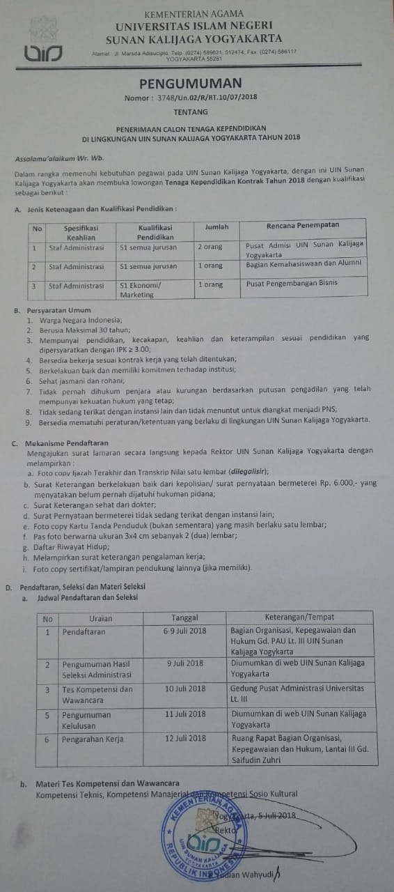 Penerimaan Calon Tenaga Kependidikan Di UIN Sunan Kalijaga Yogyakarta