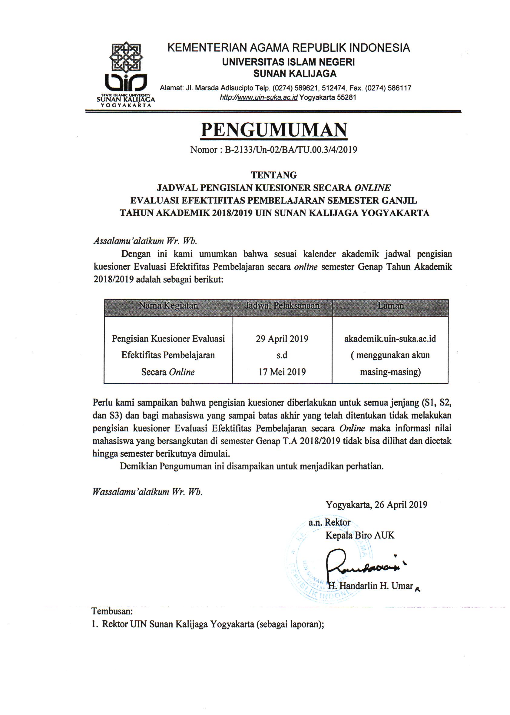 Jadwal Pengisian Kuesioner Online Evaluasi Efektifitas Pembelajaran Semester Ganjil T.A.2018/2019