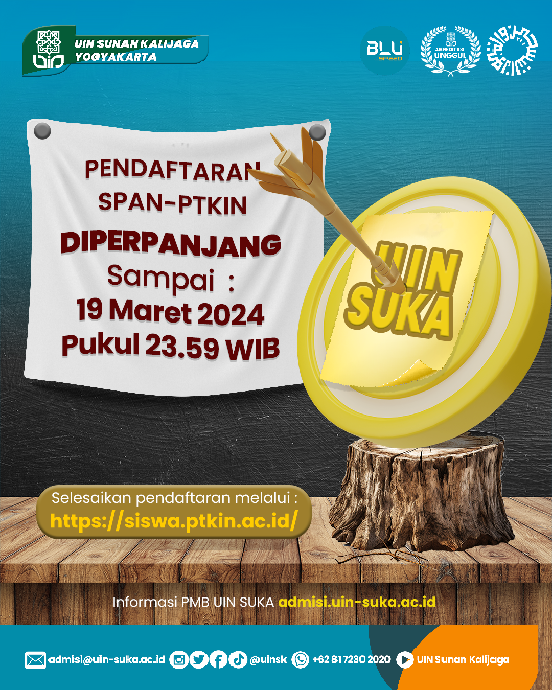 Panitia Nasional Penerimaan Mahasiswa Baru Perguruan Tinggi Keagamaan Islam Negeri (PMB PTKIN) tahun 2024, mengumumkan perpanjangan masa pendaftaran siswa untuk Seleksi Prestasi Akademik Nasional (SPAN) hingga tanggal 19 Maret 2024 sampai batas waktu pukul 23.59 WIB melalui lamanhttps://siswa.ptkin.ac.id.