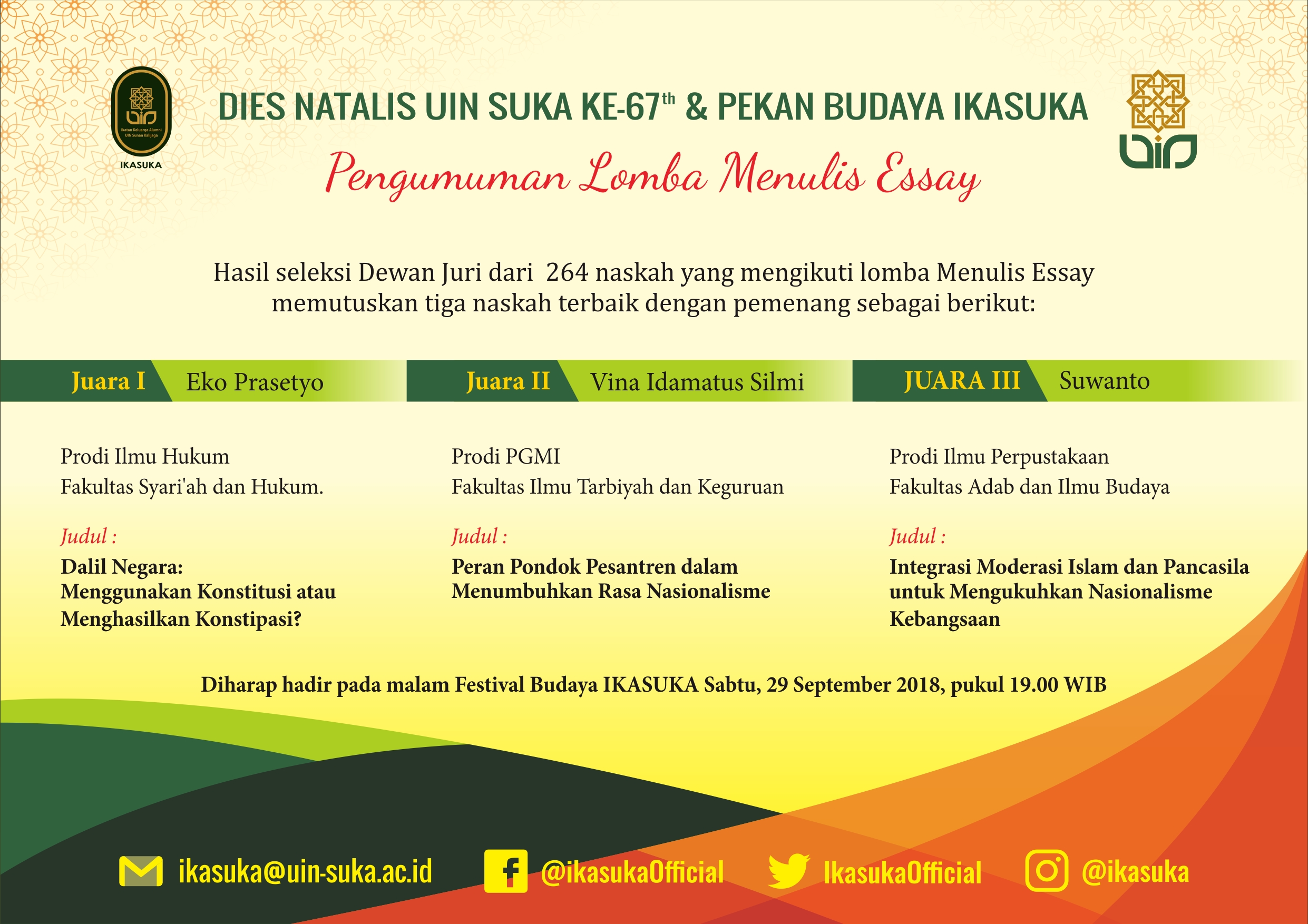 Pengumuman Lomba Menulis Essay Dies Natalis UIN Suka Ke-67 Selasa, 25 September 2018 09:42:40 WIB Dilihat : 4373 Kali Unduh