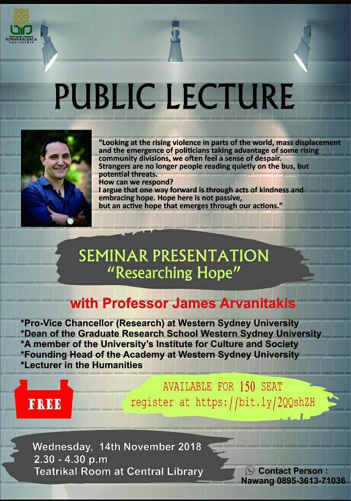 Public Lecture Seminar Presentation “Researching Hope” Rabu, 3 Oktober 2018 09:58:47 WIB Dilihat : 1614 Kali Unduh