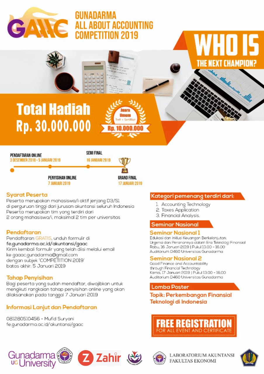 Gunadarma All About Accounting Competition 2019 Senin, 3 Desember 2018 08:28:53 WIB Dilihat : 2243 Kali Unduh