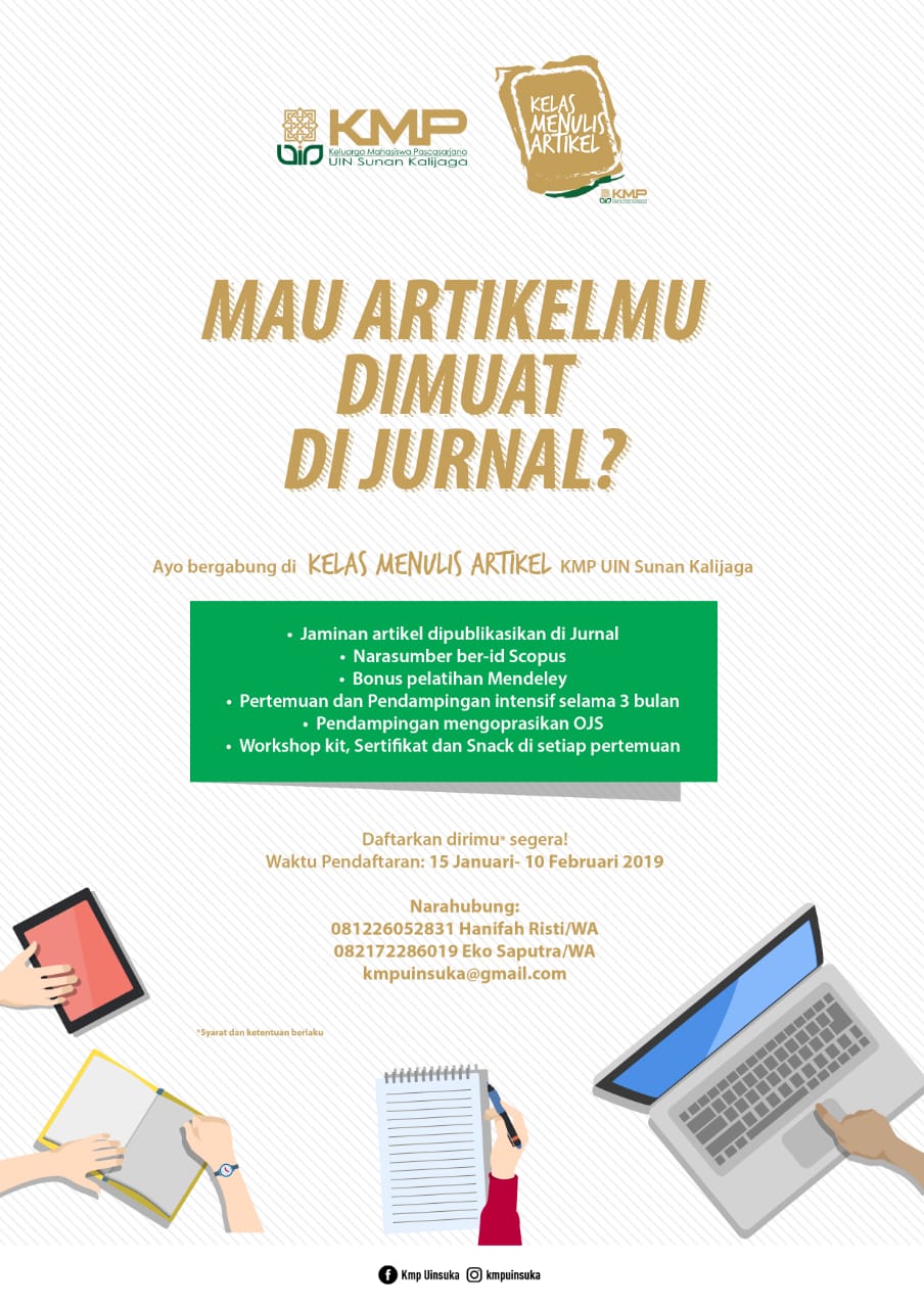 Mau Artikelmu Dimuat Di Jurnal? Bergabung Di Kelas Menulis Artikel KMP UIN Sunan Kalijaga Rabu, 23 Januari 2019 15:12:16 WIB Dilihat : 2963 Kali Unduh