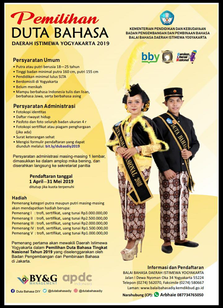 Pemilihan Duta Bahasa Daerah Istimewa Yogyakarta 2019 Rabu, 10 April 2019 08:20:42 WIB Dilihat : 3090 Kali Unduh