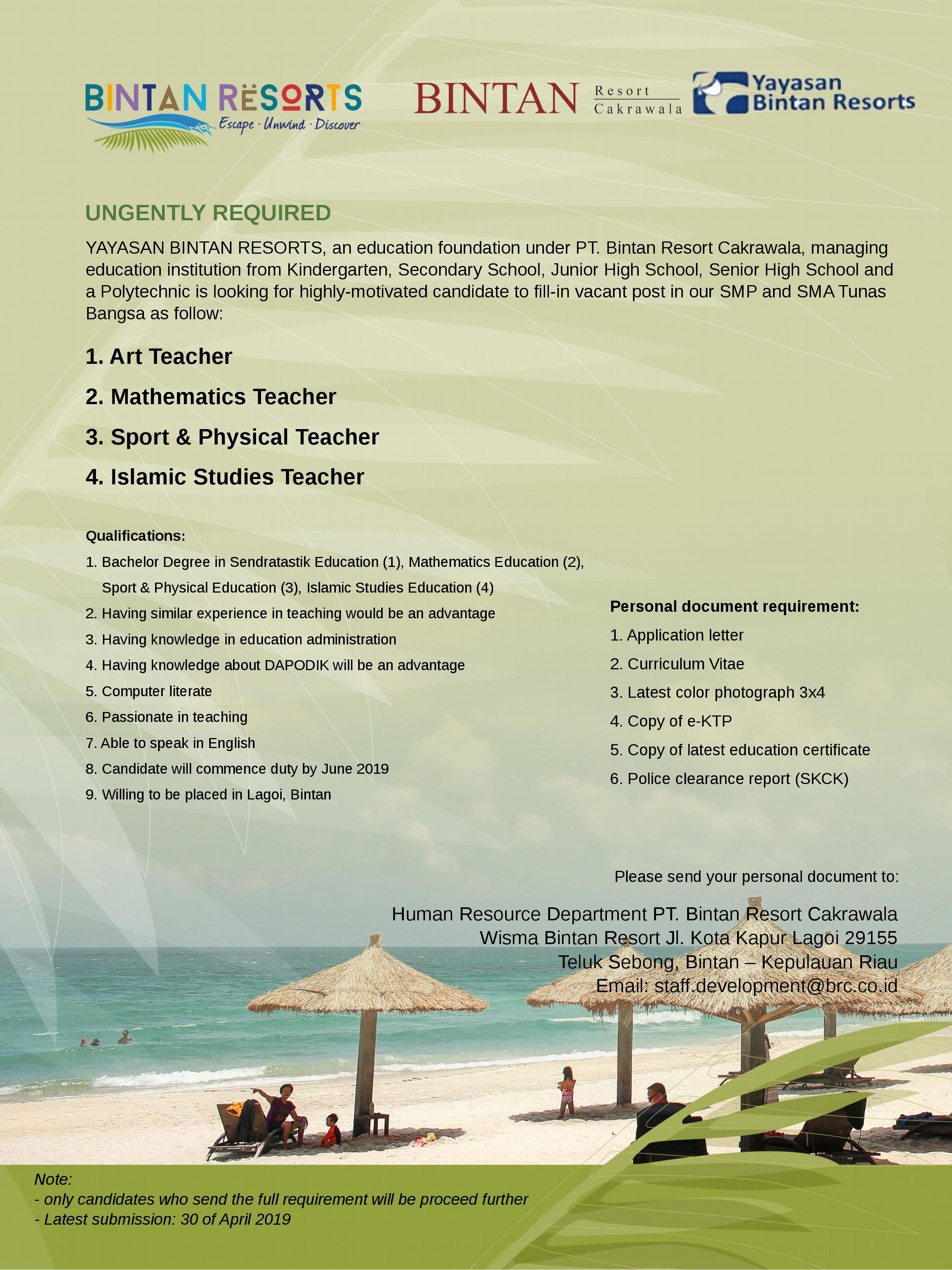 Lowongan Kerja Guru Kelas PT. Bintan Resort Cakrawala Rabu, 24 April 2019 11:32:01 WIB Dilihat : 3620 Kali Unduh