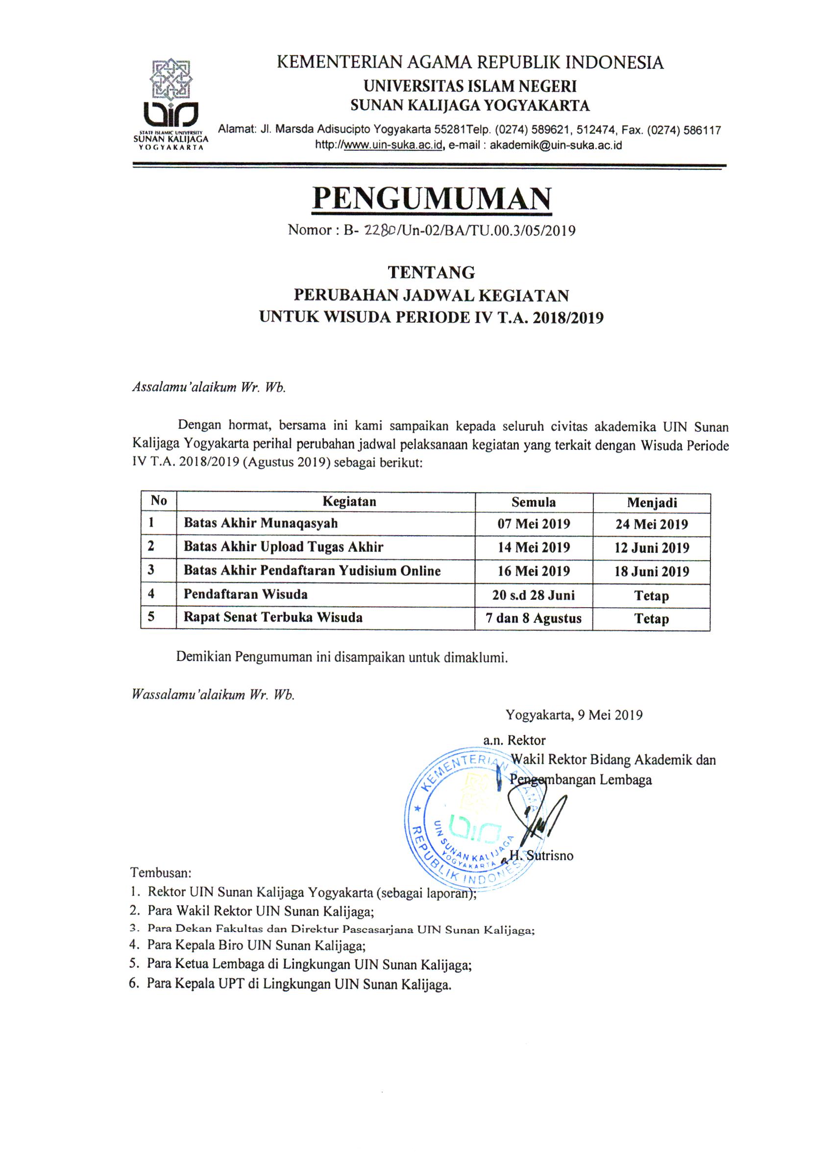 Perubahan Jadwal Kegiatan Untuk Wisuda Periode IV T.A. 2018/2019 Jumat, 10 Mei 2019 09:47:53 WIB Dilihat : 4742 Kali Unduh