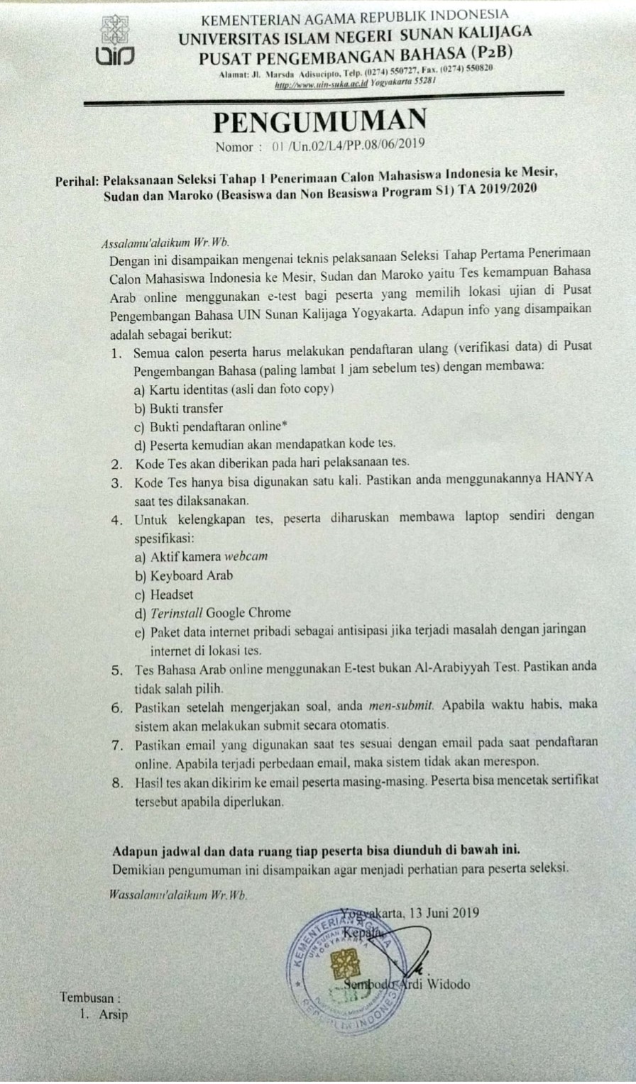 Pengumuman seleksi tahap 1 penerimaan calon mahasiswa baru Indonesia ke Mesir, Sudan, & Maroko Jumat, 14 Juni 2019 08:59:13 WIB Dilihat : 3613 Kali Unduh