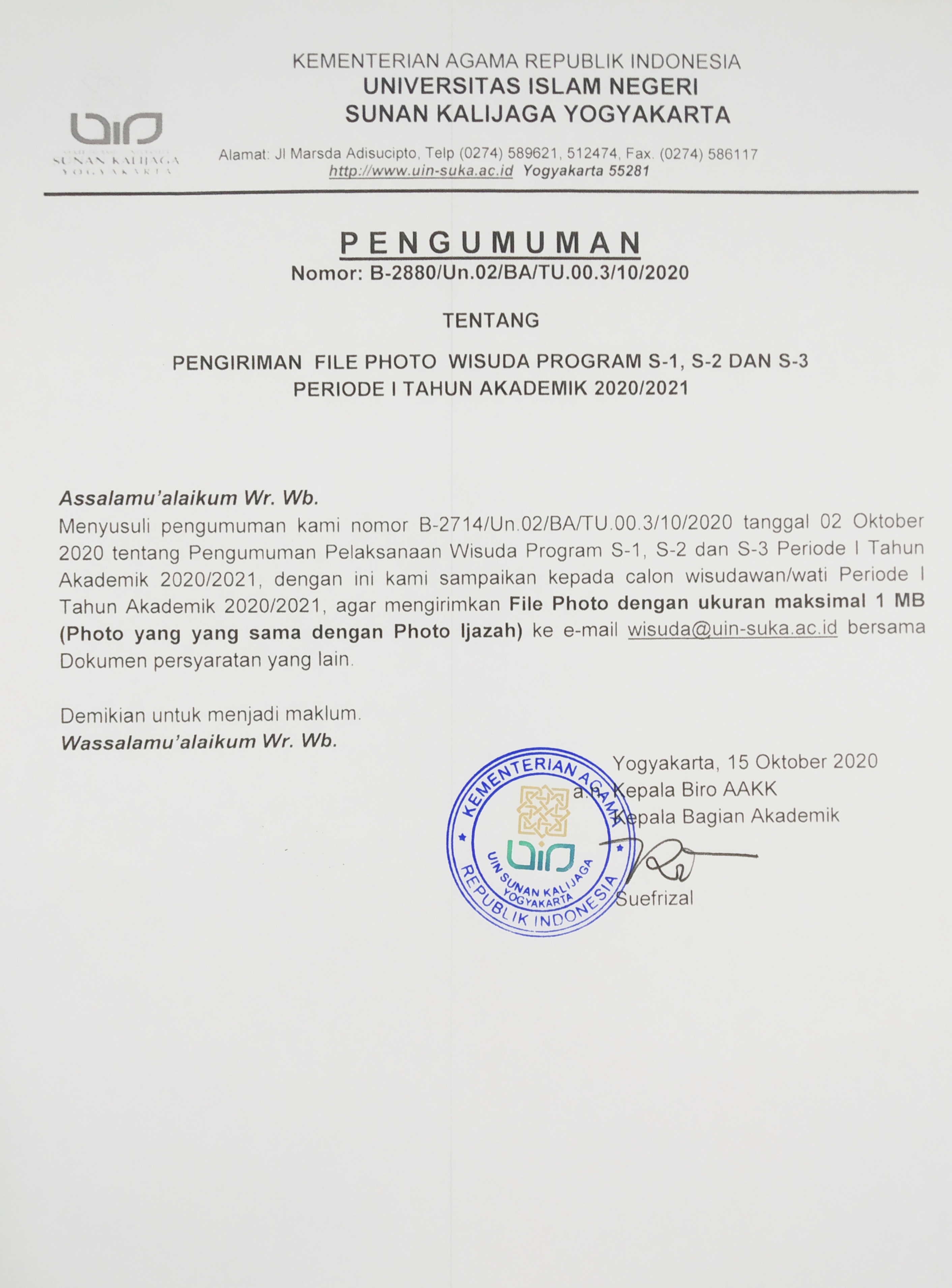 Pengiriman File Photo Wisuda Program S1, S2 dan S3 Period I T.A. 2020/2021 Kamis, 15 Oktober 2020 18:15:45 WIB Dilihat : 3048 Kali Unduh