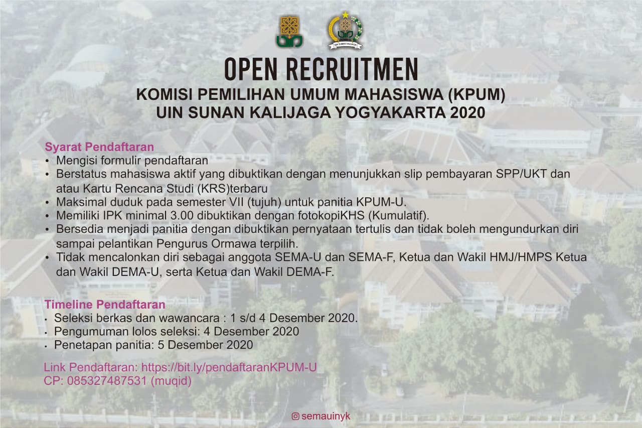 Open Recruitmen Komisi Pemilihan Umum Mahasiswa Selasa, 1 Desember 2020 10:00:26 WIB Dilihat : 2342 Kali Unduh