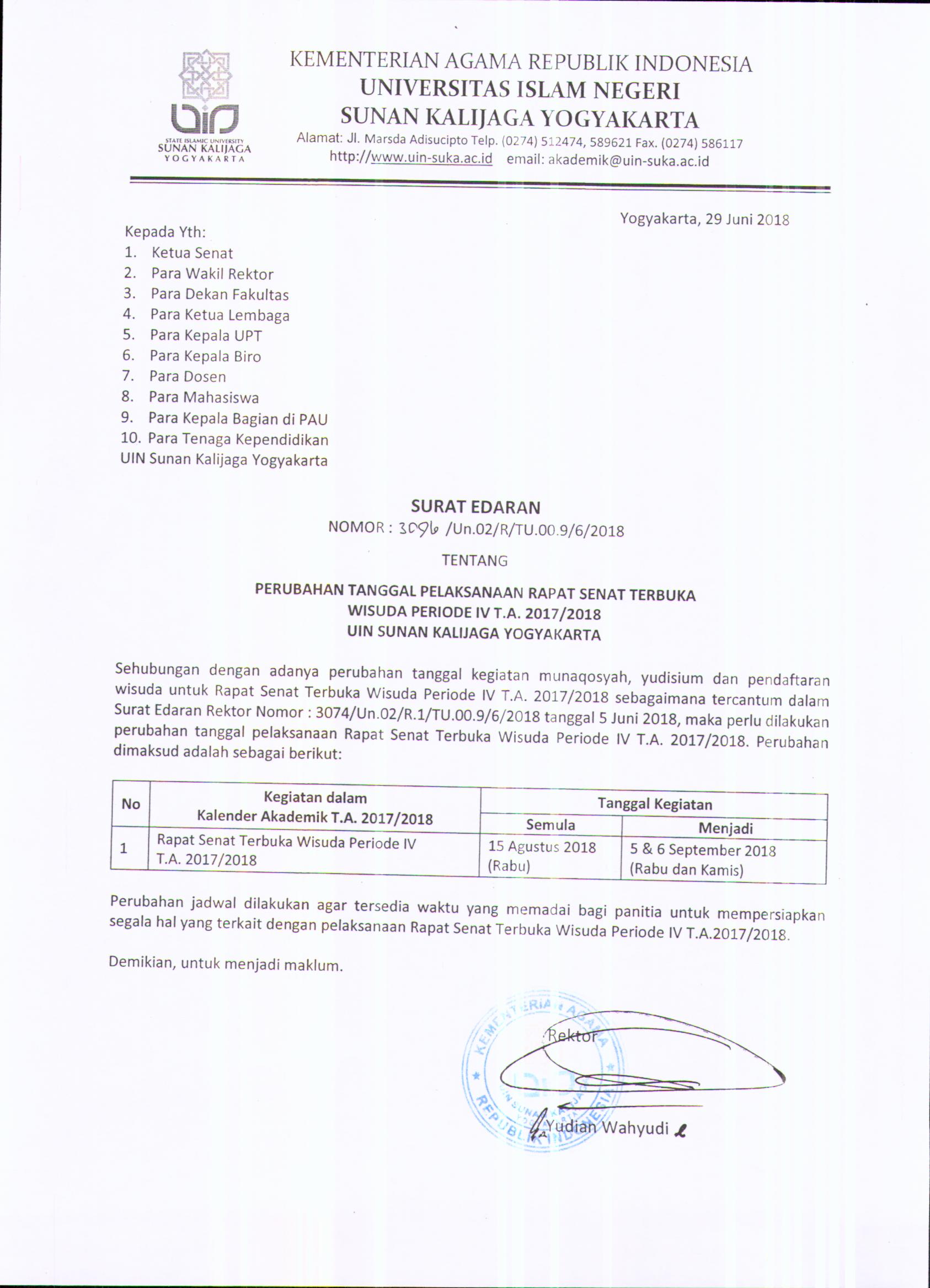 Perubahan Tanggal Pelaksanaan Wisuda Periode IV T.A. 2017/2018 Kamis, 5 Juli 2018 10:06:14 WIB Dilihat : 7099 Kali Unduh