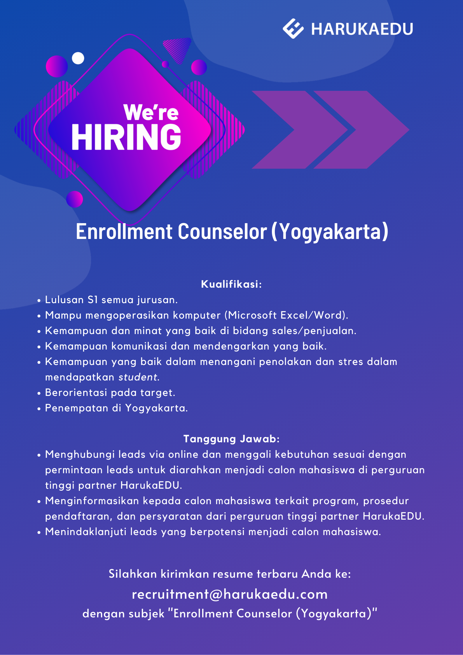 Lowongan Kerja Enrollment Counselor HarukaEdu Rabu, 28 April 2021 11:37:28 WIB Dilihat : 1623 Kali Unduh